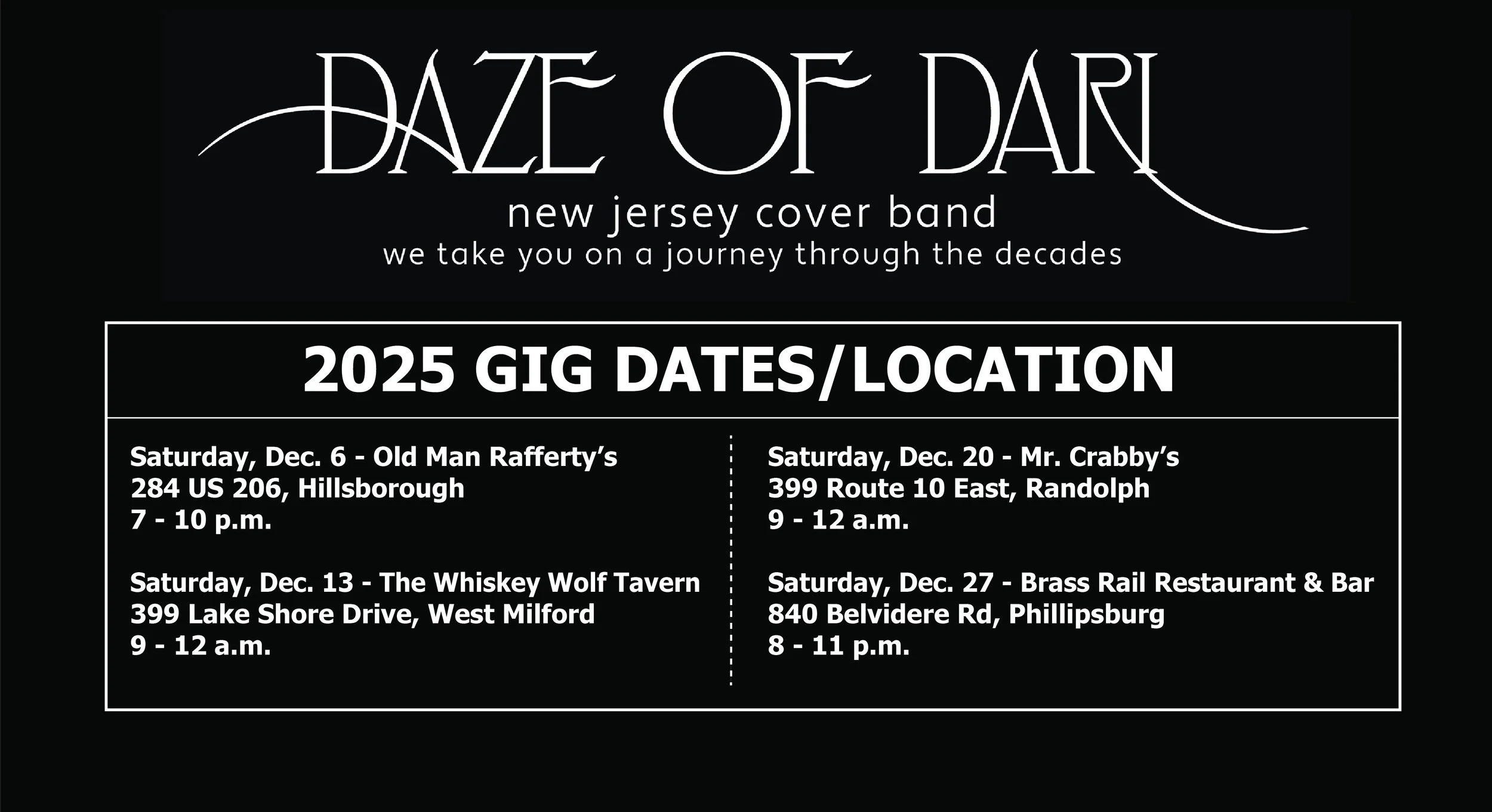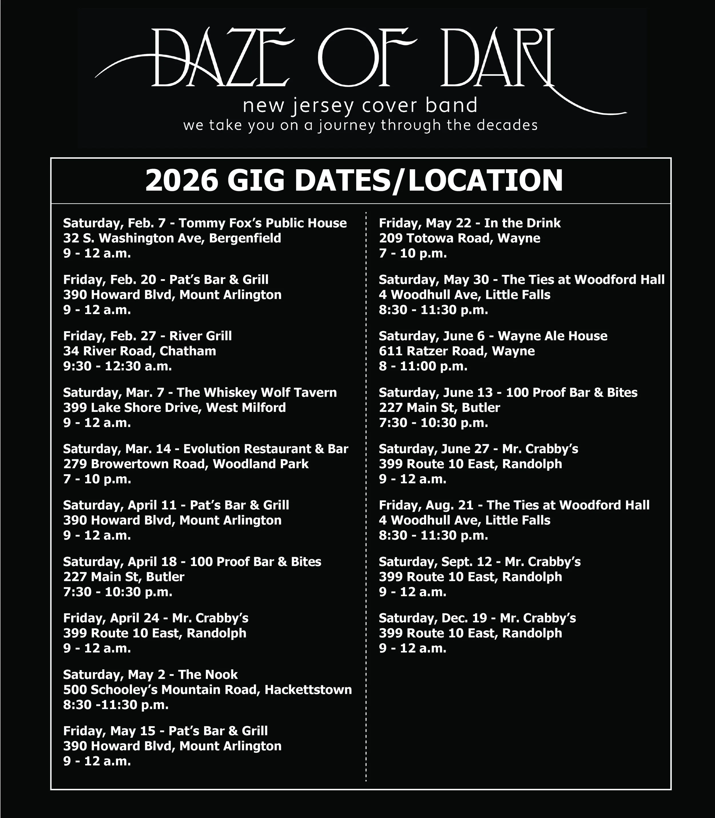 Daze of Dari will be playing on Saturday, March 30th at Pat’s Bar & Grill in Mount Arlington from 9-12.
